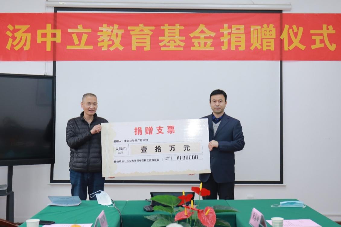 李志林先生委托大学同学魏一虎书记为汤中立教育基金捐赠壹拾万元