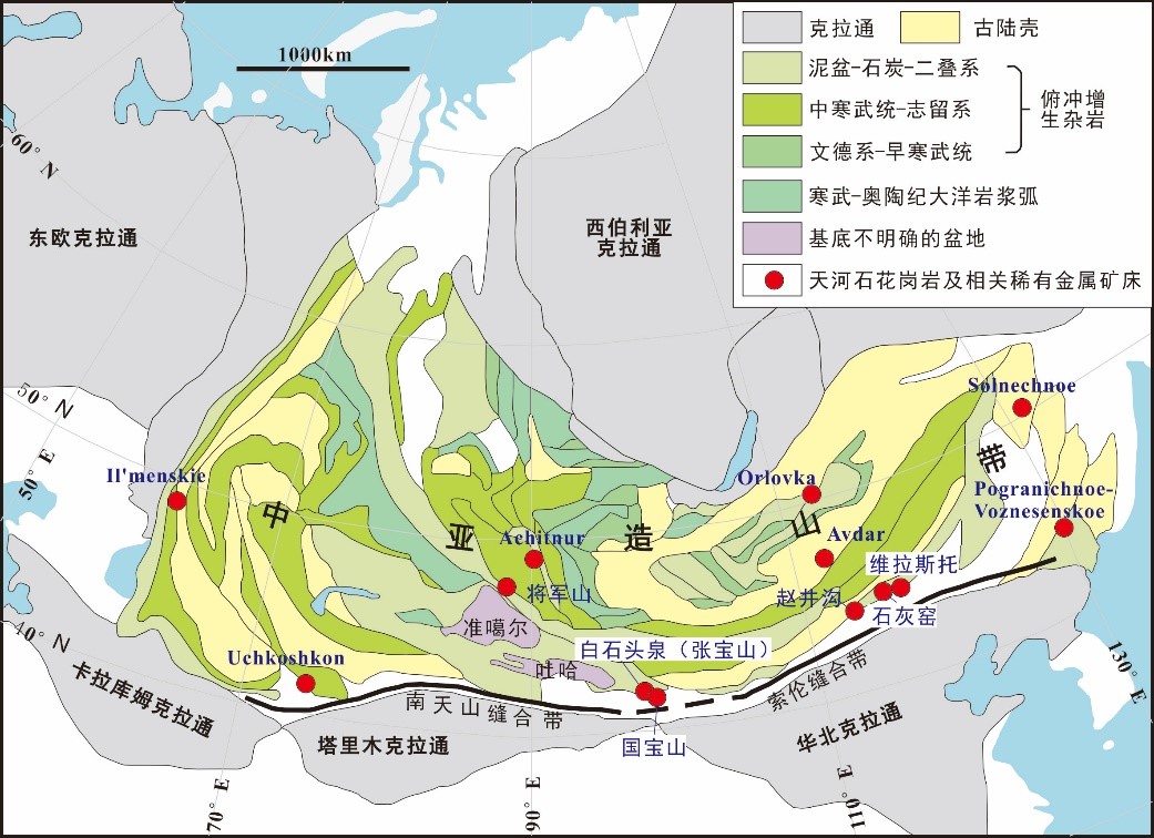 中亚造山带主要构造单元与富铷花岗岩(矿床)分布略图
