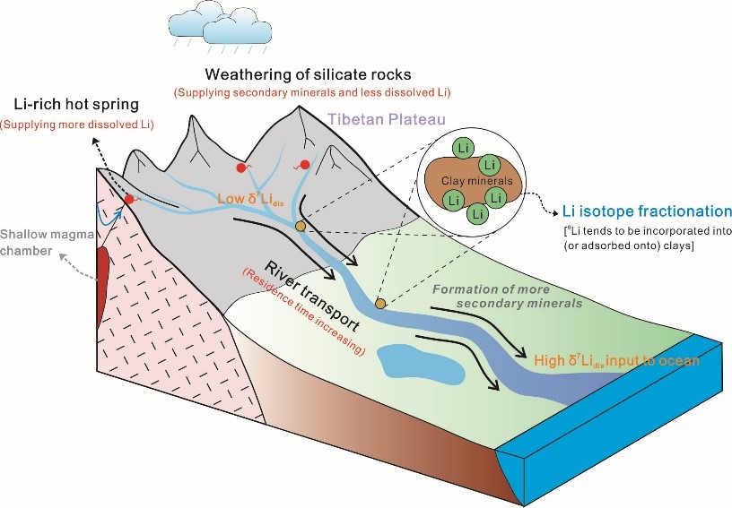 大陆硅酸盐风化通过消耗大气 CO2 影响着长时间尺度的全球气候变化,如何示踪大陆硅酸盐风化一直是学者们关注的重要科学问题。Li及其同位素具有示踪硅酸盐风化的潜力,其原因之一是Li主要赋存于硅酸盐矿物中,因此,通常认为河水中Li主要源自硅酸盐风化。然而,青藏高原地区广泛分布的热泉中Li含量异常高(ppm),热液活动是否会改变河水Li含量及其同位素组成?影响程度如何?对利用河水Li同位素组成示踪流域硅酸盐风化过程有无影响?