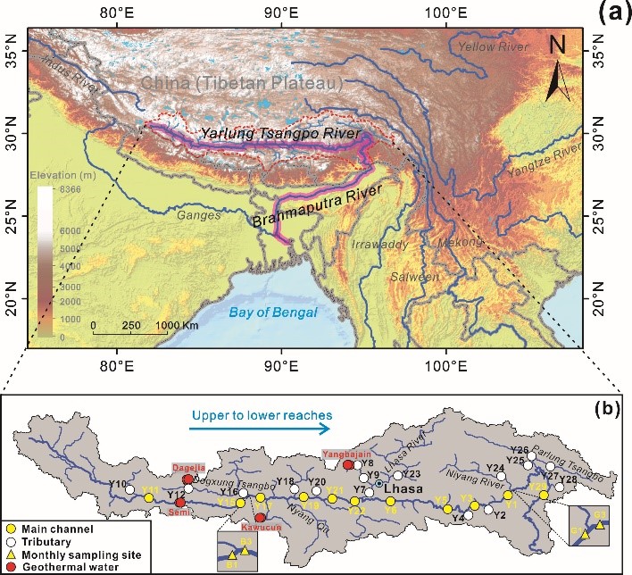 针对上述问题,本研究以雅鲁藏布江流域(以下称雅江)为目标区,系统、深入的研究结果表明:①热泉汇入是雅江溶解态Li的主要来源,其对绝大多数河水样品的贡献率超过85%;②热泉汇入显著改变了河水Li同位素组成,但无法用“热泉汇入”和“硅酸盐风化”的二元混合模型解释;③河水Li运移过程中其同位素持续分馏以及不同季节的河流悬浮物含量波动,是控制雅江溶解态δ7Li值时空变化的主要原因;④热泉Li的汇入显著增加了河流Li通量,进而升高了下游河口地区Li通量(高δ7Li值)。