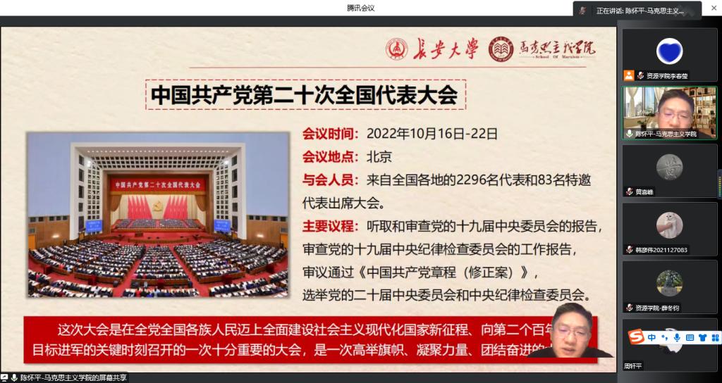 二十大精神宣讲团成员、马克思主义学院院长陈怀平教授,通过腾讯会议在线方式为学院师生党员开展党的二十大精神专题辅导报告。参加会议的有院党委理论学习中心组全体成员、党支部书记及师生党员130余人。会议由学院党委书记黄喜峰主持。