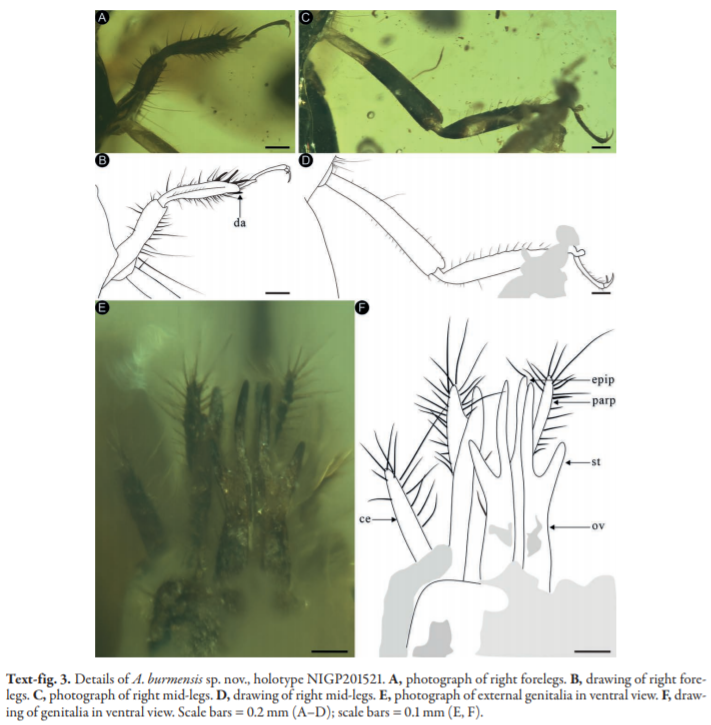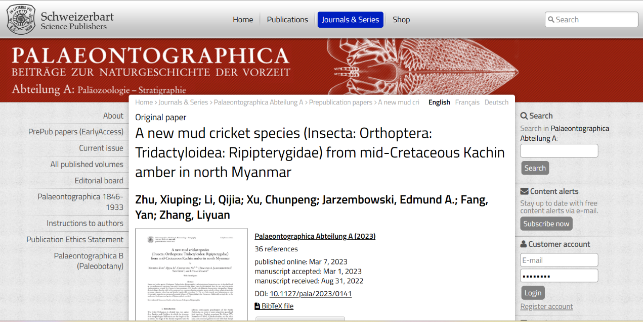 Zhu Xiuping, Li Qijia, Xu Chunpeng, Edmund A Jarzembowski, Fang Yan, Zhang,Liyuan. 2023. A new mud cricket species (Insecta: Orthoptera: Tridactyloidea: Ripipterygidae) from mid-Cretaceous Kachin amber in north Myanmar[J]. Palaeontographica Abteilung A, doi: 10.1127/pala/2023/0141