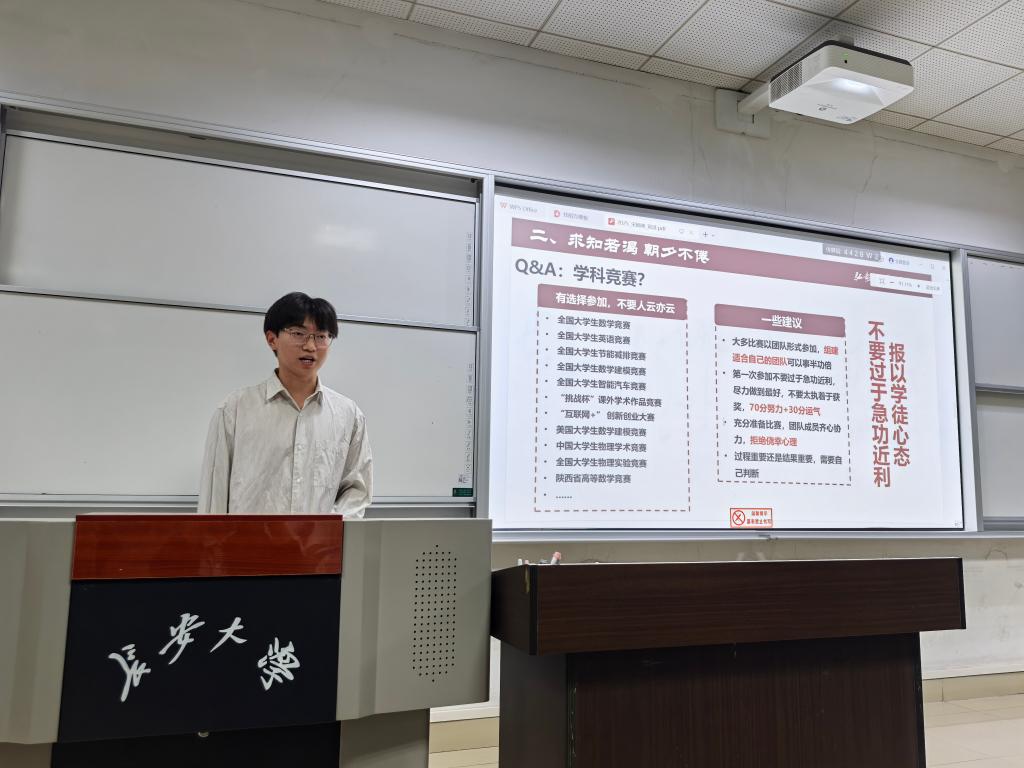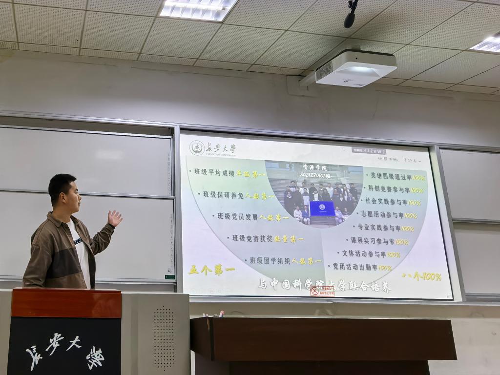 2021270101班的班长周超进行宣讲。他们分享了自己在大学期间的成长经历与取得的成绩,重点对学习方法提升、协调学习生活与学生工作时间、科创竞赛锻炼、先进班集体建设等方面介绍了自己的经验与体悟。