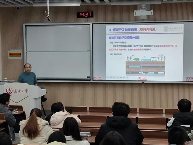 孙强教授综合考虑煤矿地下空间储能的封闭性、恒温性和容量优势以及生物质储能特征,提出了好氧空间利用模式、厌氧空间利用模式、热解空间利用模式3种储能实现路径。煤矿地下空间生物质储能地质保障的科学技术难题包括:储能环境适宜性评价与分析、储能空间合理规划与高效利用、地质体性能演化与全周期运行状态感知、资源化产物精准对征利用与储能空间循环再造。研究为煤矿地下空间高效开发与有机废弃物绿色处理提供了创新性思路,助力煤炭行业实现产能优化与生态效益的双重提升。其分享既贴合学科前沿,又紧扣“碳达峰、碳中和”国家战略,为同学们带来了兼具专业性与创新性的学术内容。
