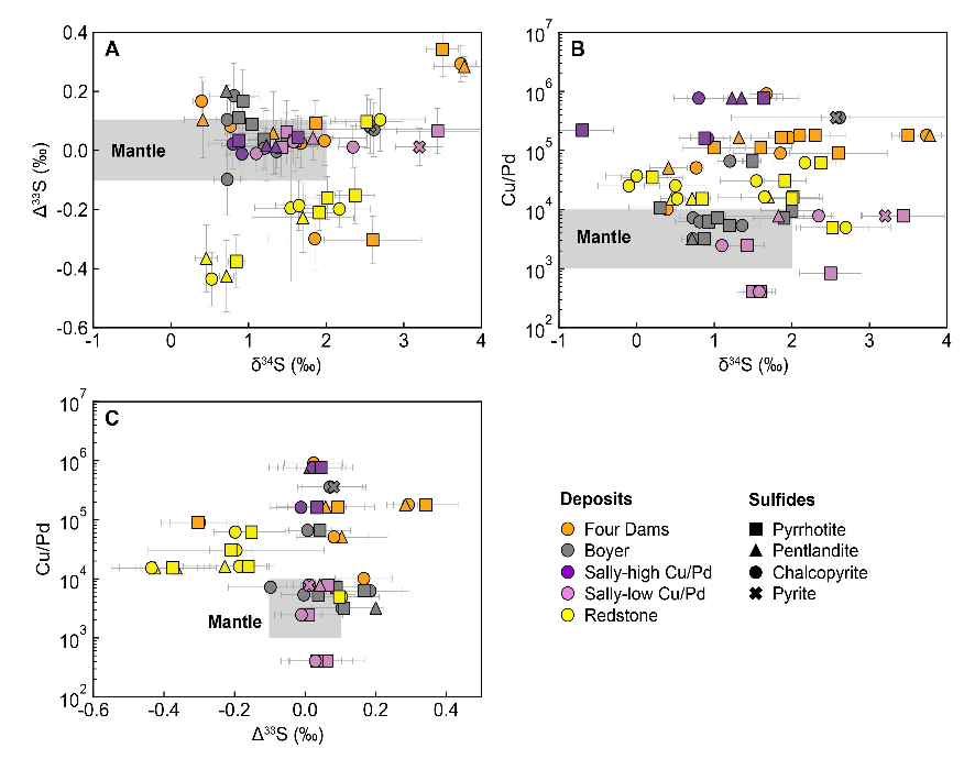 针对这些科学问题,马修教授领衔的国际铜镍硫化物矿床研究团队通过分析北美最大的Coldwell碱性杂岩体东部辉长岩套(1)Cu-Ni-PGE 矿床群的的硫同位素组成(δ³⁴SΔ³³S)以及全岩Cu/Pd比值,发现(图2):北部矿床的δ³⁴S值(-0.7‰3.78‰)和Δ³³S值(-0.44‰0.34‰)显著偏离地幔范围(δ³⁴S=0±2‰Δ³³S=0±0.1‰)。据此,研究团队提出,(1)北部矿床群中的硫有约20%来自太古代地壳,硫化物经过多期次分离与PGE(铂族元素)动态再富集;(2)东部Marathon 矿床硫源均来自地幔,深部没有出现硫化物熔离,岩浆快速上升导致地壳混染极弱(3)。本次研究为岩浆通道型矿床中硫同位素的分馏机制及PGE成矿动力学提供了新视角。