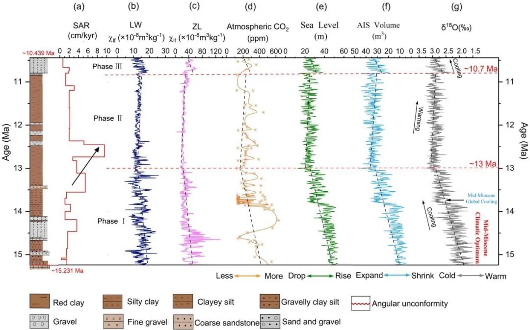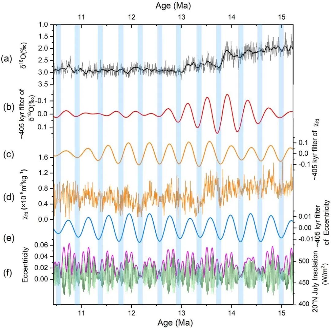 符超峰教授团队,联合中国科学院地球环境研究所强小科研究员和宋友桂研究员,湖北师范大学张蕊讲师,以尖扎盆地(15.231–10.439 Ma)发育的一套连续的风成红粘土沉积物(厚度为89.1 m)为研究对象,基于磁性地层学,锆石U-Ph定年和旋回地层学等方法,并整合青藏高原东北缘邻近盆地和全球气候变化的典型气候记录,揭示了中-中新世东亚夏季风在轨道和构造尺度上的变化及驱动机制。为阐明青藏高原抬升和东亚季风之间的联系,以及在全球气候变化下驱动东亚季风演变提供了重要的参考意义。研究结果表明,(1)尖扎盆地89.1 m厚的浪哇剖面开展磁性地层学和旋回地层学研究,建立了15.231至10.439 Ma的高精度天文年代标尺(2)东亚夏季风在15.231–10.439 Ma期间的演化划分为三个阶段:15.231–13 Ma间快速减弱期、13.0–10.7Ma间相对稳定但略有增强期、以及10.7–10.439 Ma间显著减弱期;(3)碎屑锆石U–Pb物源示踪与基于磁性地层学的沉积速率分析揭示了14.08-10.2 Ma间研究区物源变化,这归因于西秦岭山脉在13-12 Ma期间的快速隆升及其对青藏高原隆升的远程响应;(4)LW剖面的沉积速率分析证实,在盆地边缘斜坡带(临界坡度2°–3°范围内),风成沉积速率显著超过河流沉积速率,这种"弱河相-强风相"模式受双重机制驱动:坡度限制河流沉积作用,基岩-风积耦合增强沉积物捕获;(5)在轨道时间尺度上,频率磁化率记录显示出显著的长偏心率周期(~405 kyr),表明偏心率调控的低纬度夏季太阳辐射与南极冰盖波动共同主导了高原东北缘的长期降水变率。