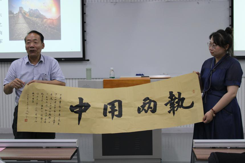 讲座最后,段联合老师向大家展示了亲笔题写的“执两用中”书法作品,以中庸四义中的“中正平和、万事有度、辩证观物、和而不同”,鼓励同学们传承和发扬中华优秀传统文化,坚定初心、牢记使命,增强文化自信并积极向党组织靠拢,以仁德为基本、忠义为行为准则,以为人民服务为宗旨,强化“大我”意识,把自己所学融入国家发展需要之中。