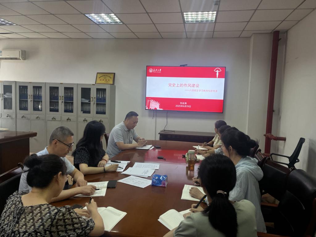 为深入贯彻中央八项规定精神学习教育成效经验,深入推进作风建设,强化党员干部责任担当,2025年6月19日,学院党委副书记刘会涛以《党史上的作风建设》为题为机关实验党支部党员讲授专题党课。