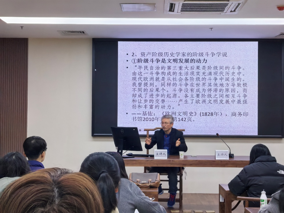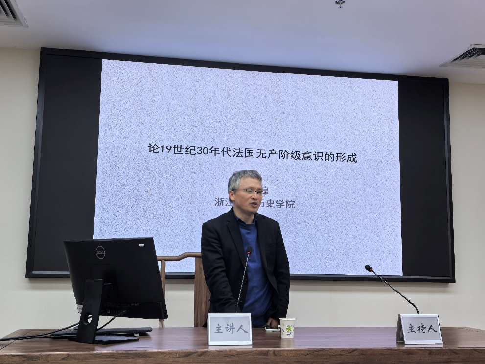 2025年11月25日下午,杭州师范大学人文学院太炎讲堂“区域国别视野下的城市、乡村与社会”系列讲座第334期,在恕园23-314会议室如期举行。浙江大学历史学院教授、世界史研究所所长、中国法国史研究会会长乐启良老师应邀来我院做了题为“论19世纪30年代法国无产阶级意识的形成”的讲座。周真真老师主持了本次讲座,施华辉老师以及研究生、本科生等四十余人参与其中。