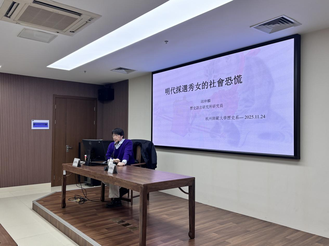 2025年11月24日下午,杭州师范大学人文学院太炎讲堂“比较视野下的制度与思想文化”系列讲座第336讲在恕园23号楼314会议室顺利举办。台北“中研院”历史语言研究所研究员邱仲麟受邀就“明代采选秀女的社会恐慌”一题作专题讲座。讲座由杭州师范大学人文学院历史学系副教授余清良主持,张赟冰、余辉、赵卓等老师及研究生、本科生一同到场聆听本次讲座。